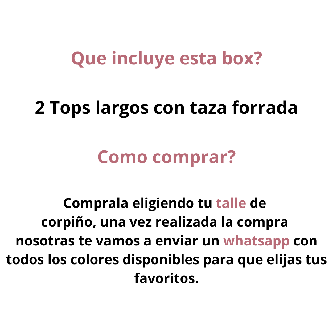 Con este pack llevás 2 Top clasic que podés usar como corpiño o para salir. Una vez que hayas realizado la compra te vamos a escribir al whatsapp para enviarte los colores disponibles y que los elijas.