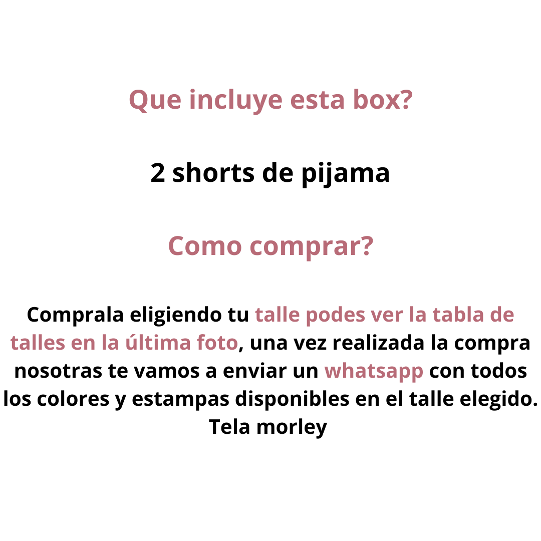 Esta box te permite tener 2 shorts de pijamas a un precio increible. Una vez realizada la compra te enviamos todos los diseños disponibles en tu talle por whatsapp asi los elegis
