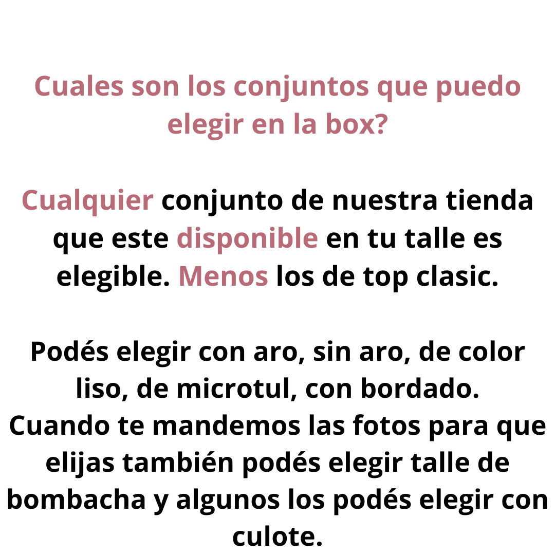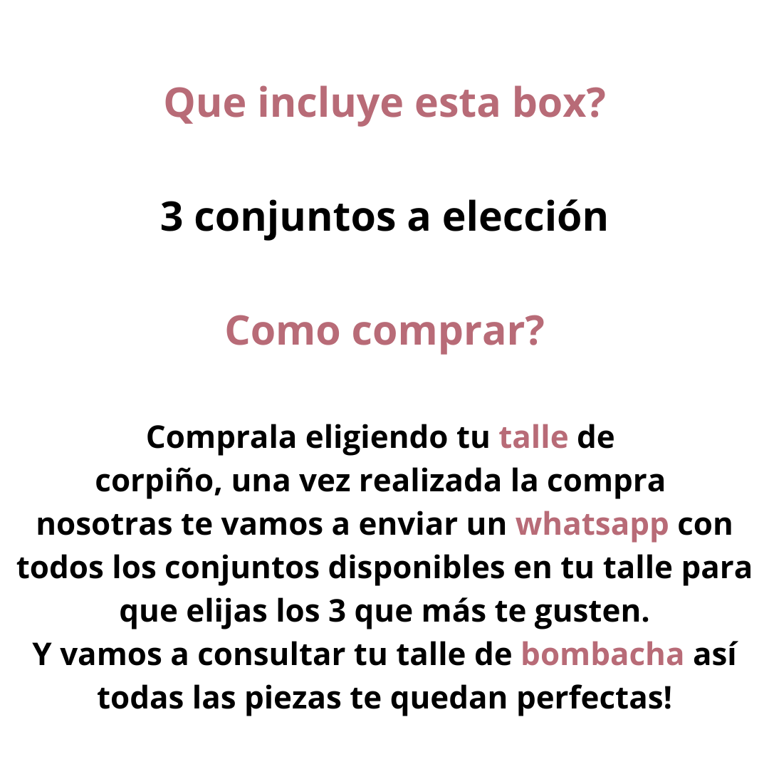 Con este pack llevás 3 conjuntos con aro o sin aro a elección. Elegí tu talle y una vez que hayas realizado la compra te vamos a enviar por whatsapp las opciones que hay disponibles en stock para que elijas tus 3 conjuntos con las bombachas también por talle.