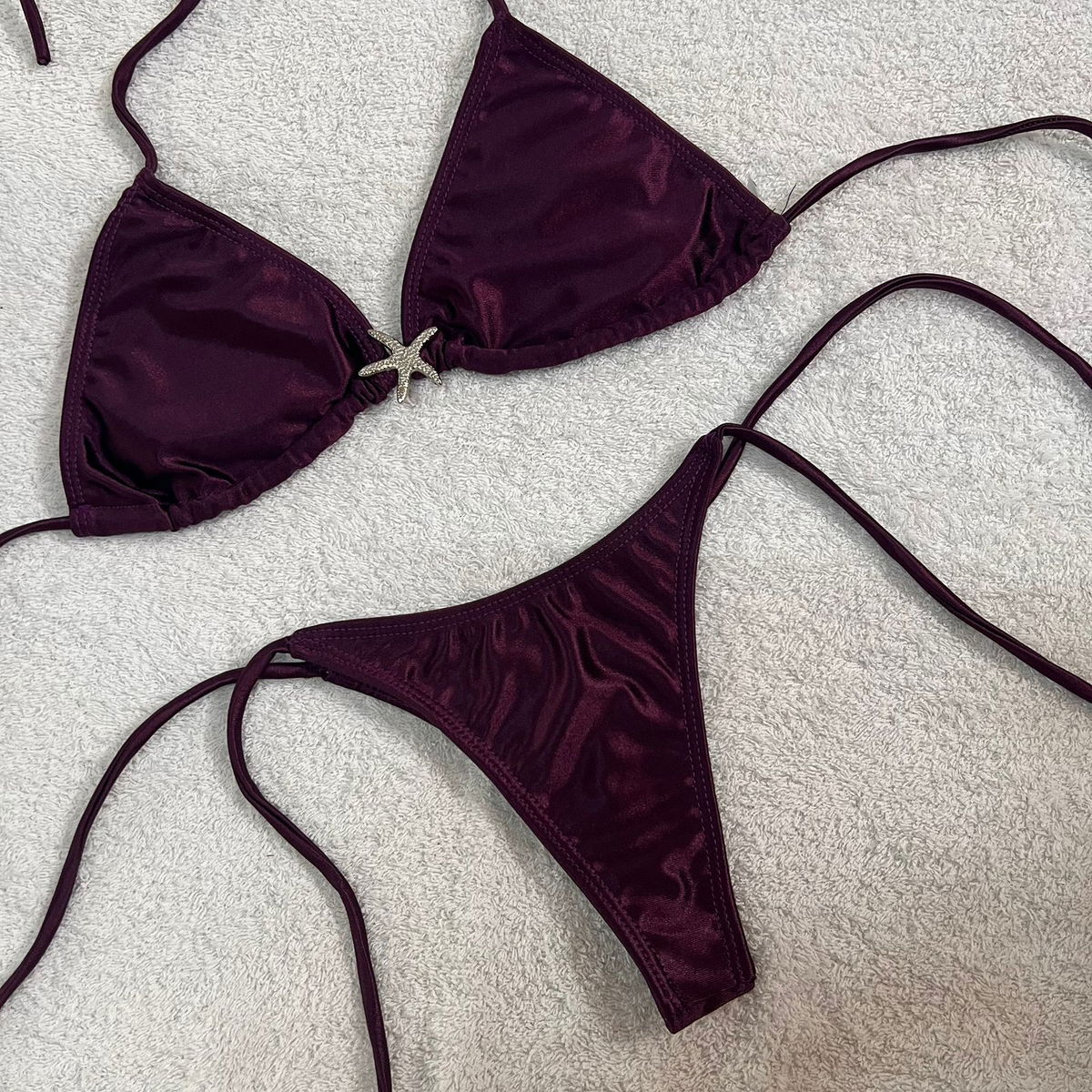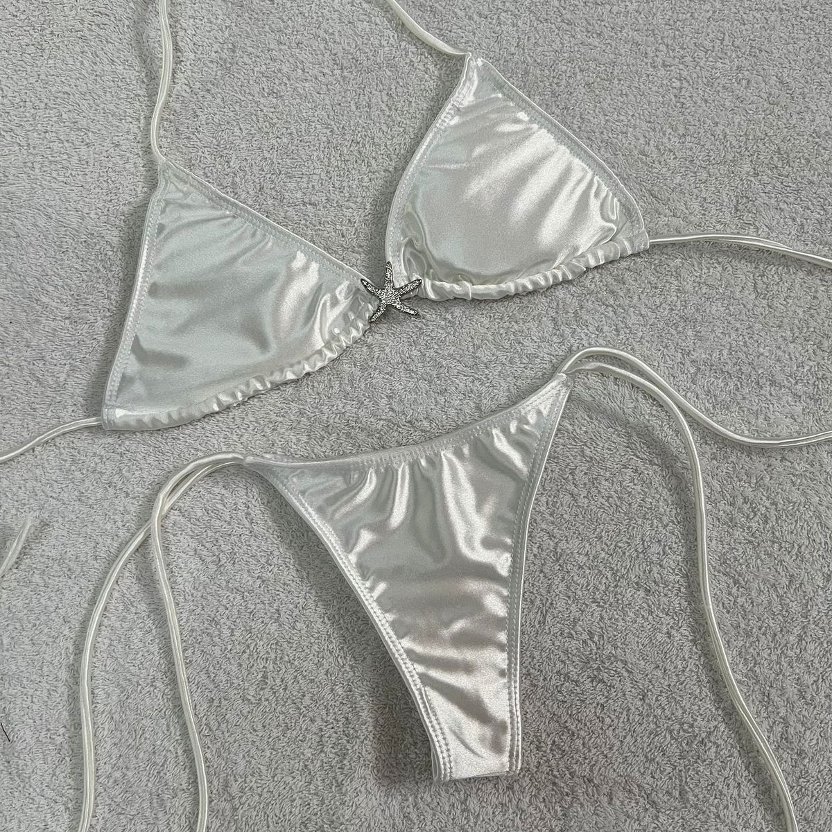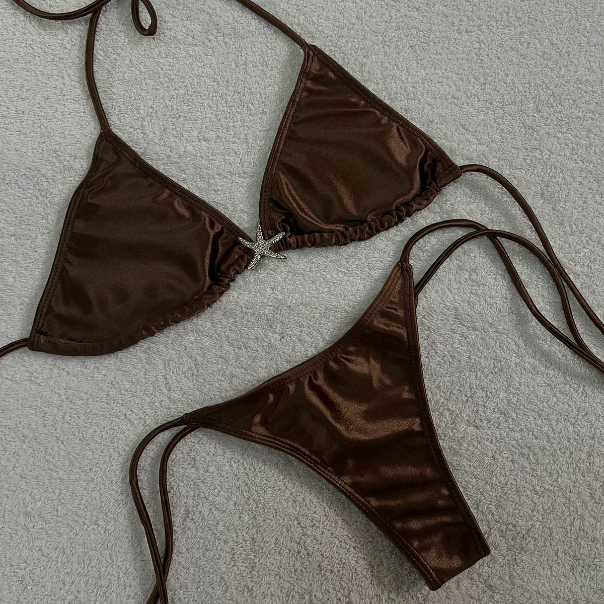 Bikini con aplique de estrella, tazas desmontables, tela shine.