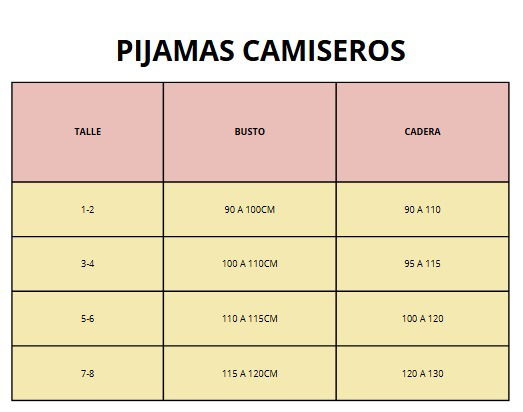 Si querés un pijama camisero (los que tienen botones en la parte de arriba) te dejamos la tabla, la tela es mega elastizada así que abarca de a dos talles:
